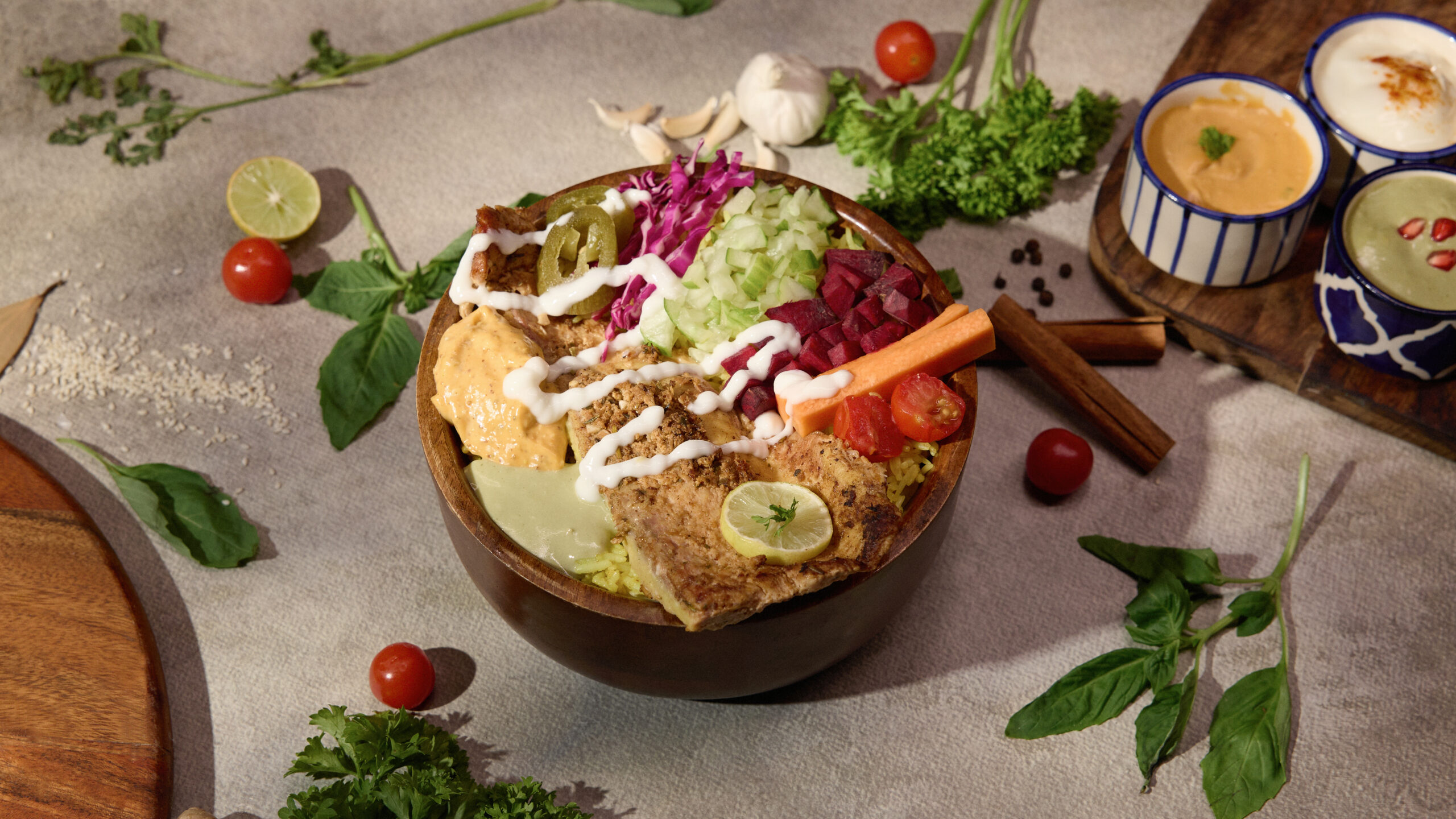 Base: Greens + Quinoa | Protein: Fish Shawarma | Spreads: Hummus, Garlic White Sauce | Toppings: Cucumber-Tomato Mix, Sumac Onions,…