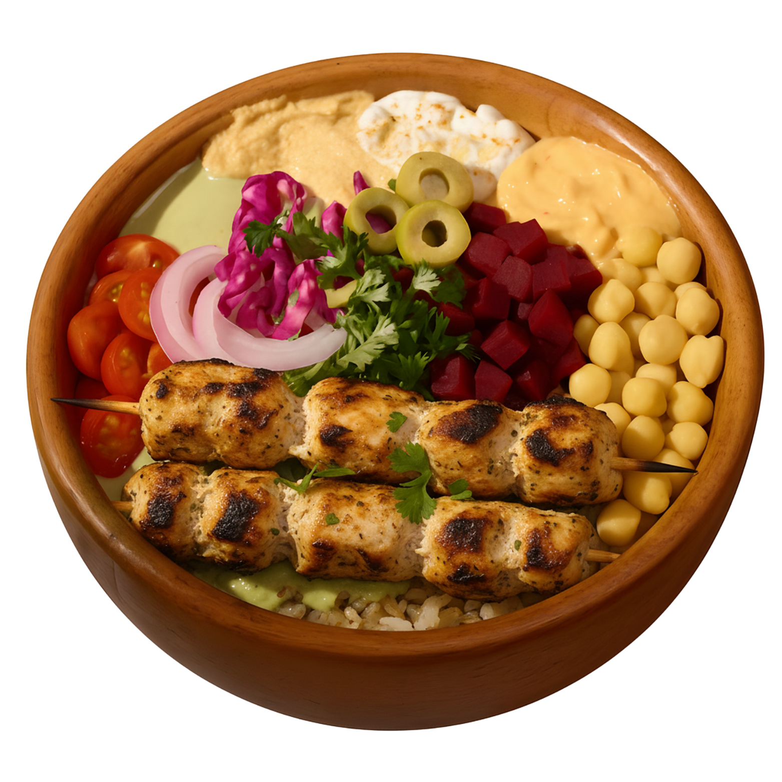 Base: Turmeric Rice | Protein: Chicken Kebab | Spread: Hummus, Garlic White Sauce, Yogurt Sauce | Toppings: Red Cabbage, Sprouts, Mint, Micro Greens | Sauce: Spicy Tahini