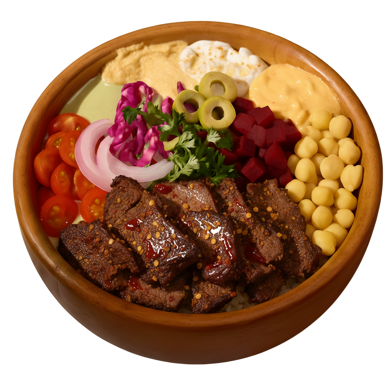 Base: Turmeric Rice | Protein: Lamb Shawarma | Spreads: Hummus, Babaganoush | Toppings: Red Cabbage, Cherry Peppers, Olives | Sauce: Spicy Tahini, Hot Sauce, Yogurt Sauce, Garlic White Sauce